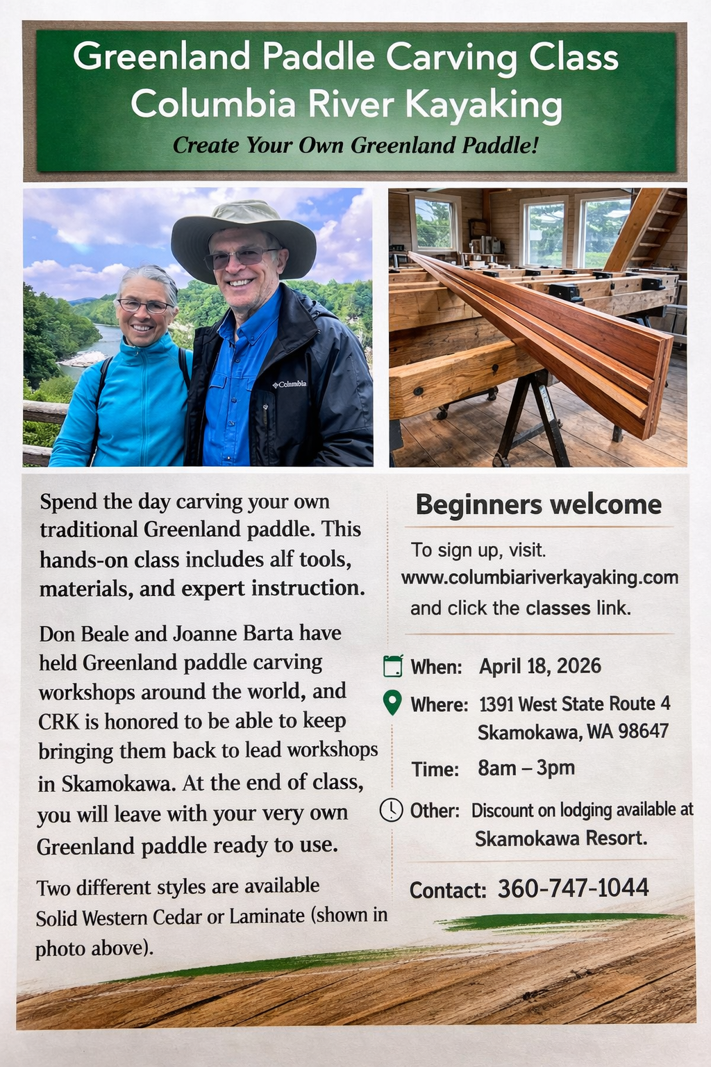 Columbia River Kayaking 1391 West State Route 4, SkamokawaSpend the day carving your own traditional Greenland paddle. This hands-on class includes all tools, materials, and expert instruction. Don Beale and Joanne Barta have held Greenland paddle carving workshops […]